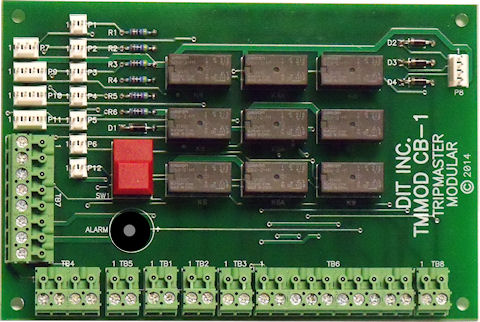 The CB1 controls the features and function of the TMMOD. All power connections, EPO inputs, Alarm Outputs, EPOB boards, time delays, batteries,leds and switches connect to this board.